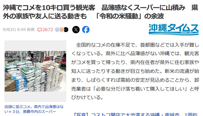沖縄でコメを10キロ買う観光客 品薄感なくスーパーに山積み 県外の家族や友人に送る動きも 「令和の米騒動」の余波