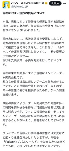 【朗報】パルワールド、全インディーズゲームの未来のために任天堂と徹底抗戦すると発表