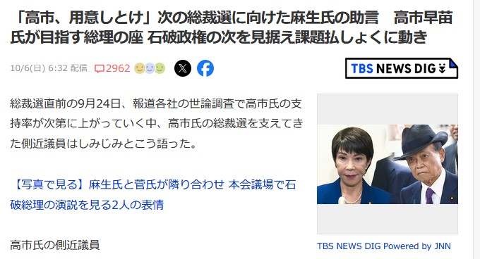 麻生太郎「高市、用意しとけ。俺も菅も一年で終わった。石破はもっと短いかもしれねえ。これから半年くらい飲み会に行け」