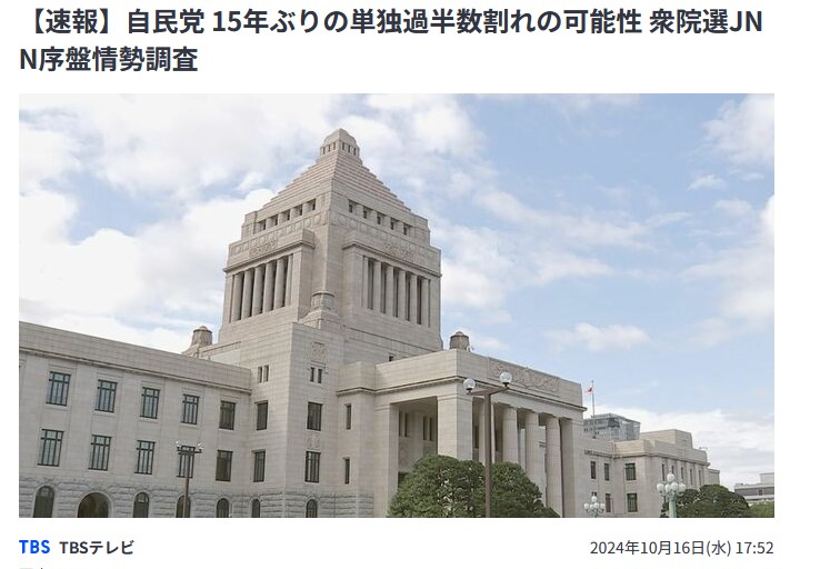 【速報】自民党 15年ぶりの単独過半数割れの可能性 衆院選JNN序盤情勢調査