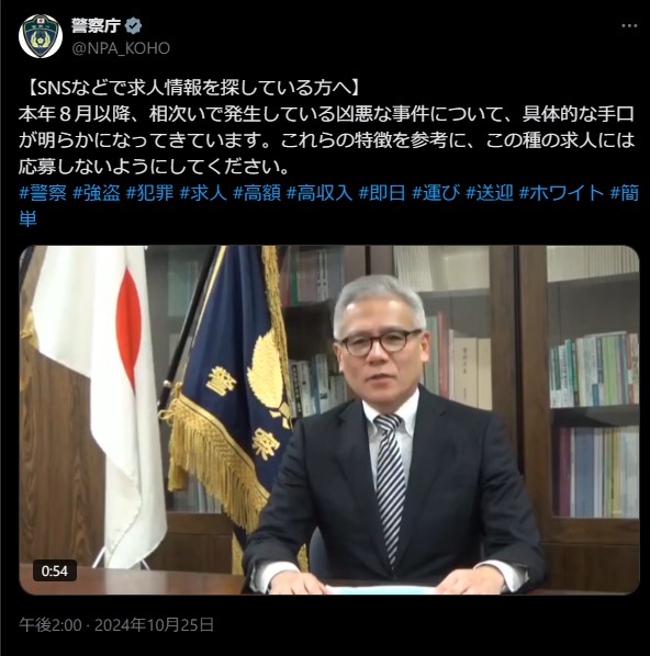 警察庁、闇バイトに加担しないよう注意を促す動画発信後に少なくとも3人を保護