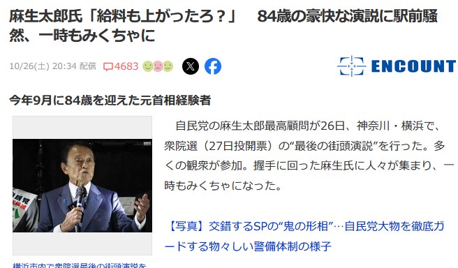 麻生太郎氏「給料も上がったろ?」 84歳の豪快な演説に駅前騒然、一時もみくちゃに