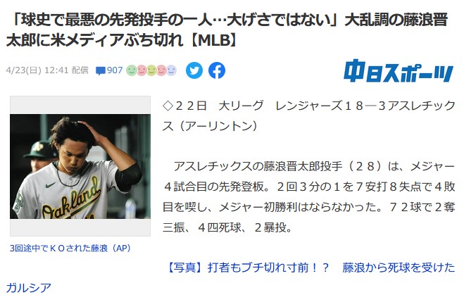 「球史で最悪の先発投手の一人…大げさではない」大乱調の藤浪晋太郎に米メディアぶち切れ【MLB】