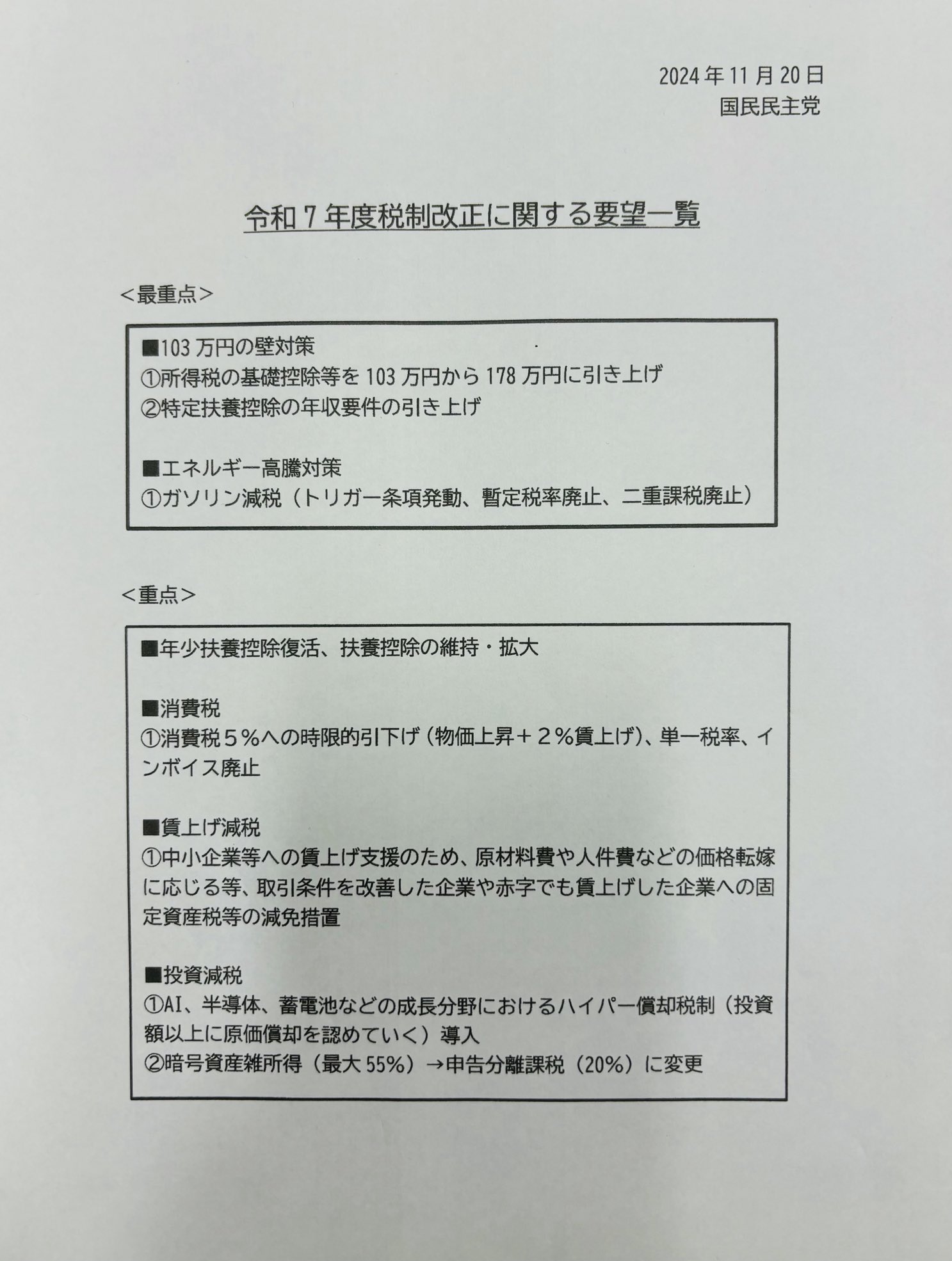 経済対策・補正予算の議論と同時に、税制改正の議論もスタートしました。本日、与党側に国民民主党の税制改正要望を伝えました。皆さんから要望の多かった年少扶養控除の復活や、暗号資産への申告分離課税の導入なども盛り込んでいます。実現に向けた応援よろしくお願いします。#国民民主党