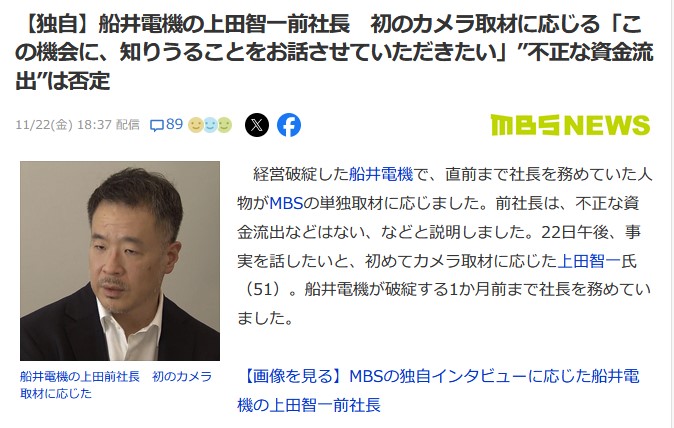 【独自】船井電機の上田智一前社長 初のカメラ取材に応じる「この機会に、知りうることをお話させていただきたい」”不正な資金流出”は否定