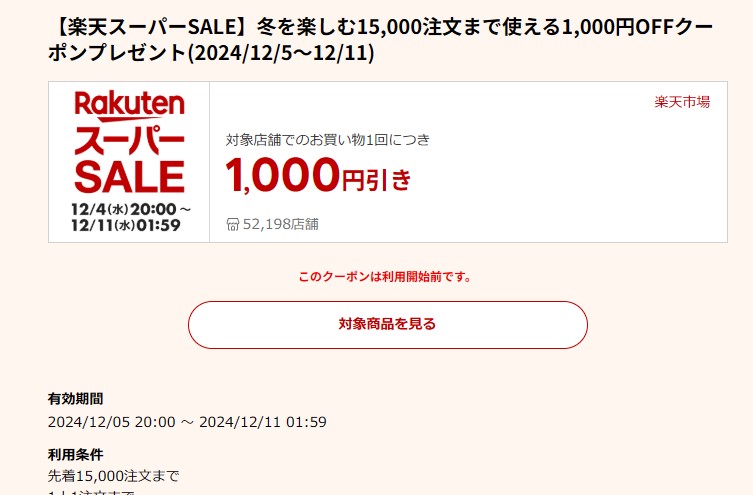 楽天市場スーパーSALE、1.5万円以上で使える1000円オフクーポンが5日20時から利用可能 1万円以上で使える500円オフクーポンも