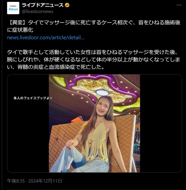 タイで歌手として活動していた女性は首をひねるマッサージを受けた後、腕にしびれや、体が硬くなるなどして体の半分以上が動かなくなってしまい、脊髄の炎症と血流感染症で死亡した。