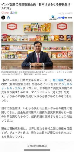 インド出身の亀田製菓会長「日本はもっと移民を受け入れる必要がある」→大炎上