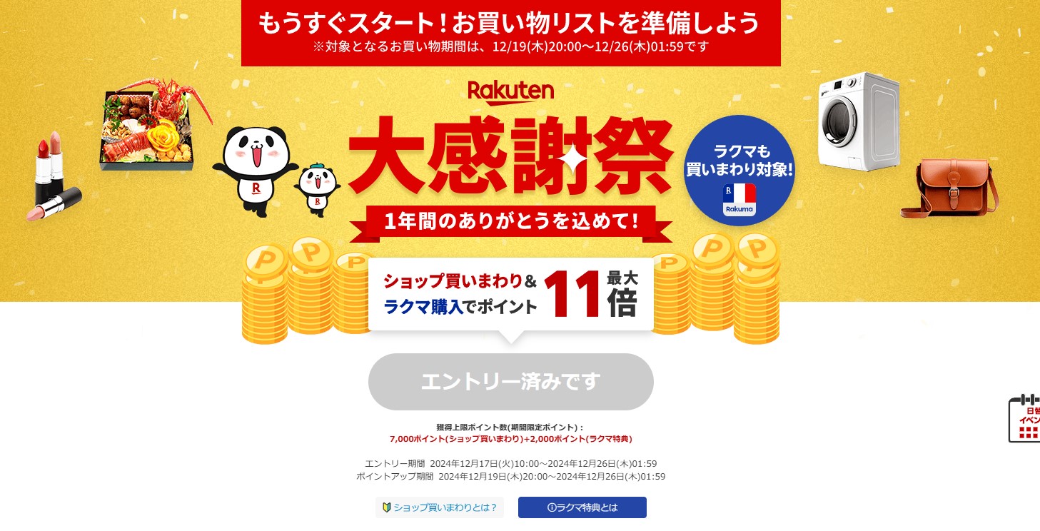 2024/12/19 20:00:00 – 2024/12/26 01:59:59 楽天大感謝祭