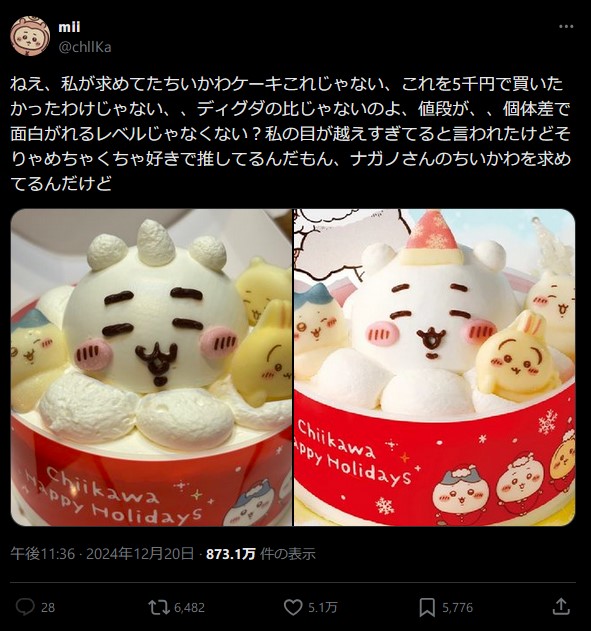 ねえ、私が求めてたちいかわケーキこれじゃない、これを5千円で買いたかったわけじゃない、、ディグダの比じゃないのよ、値段が、、個体差で面白がれるレベルじゃなくない?私の目が越えすぎてると言われたけどそりゃめちゃくちゃ好きで推してるんだもん、ナガノさんのちいかわを求めてるんだけど
