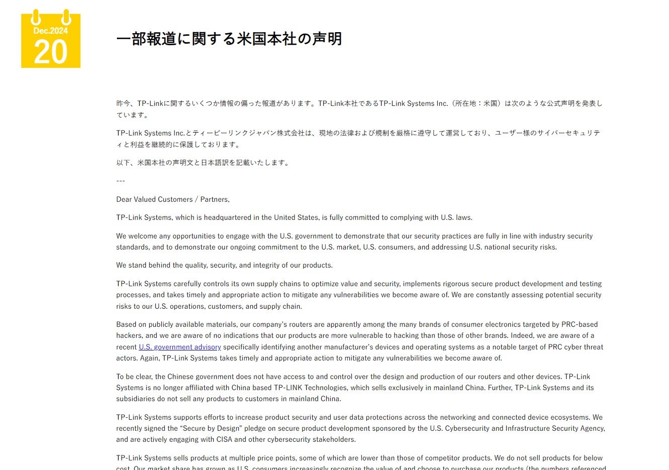 昨今、TP-Linkに関するいくつか情報の偏った報道があります。TP-Link本社であるTP-Link Systems Inc.(所在地:米国)は次のような公式声明を発表しています。