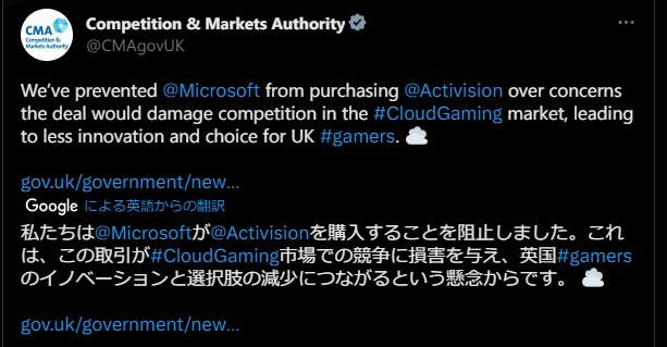 私たちは@Microsoftが@Activisionを購入することを阻止しました。これは、この取引が#CloudGaming市場での競争に損害を与え、英国#gamersのイノベーションと選択肢の減少につながるという懸念からです。