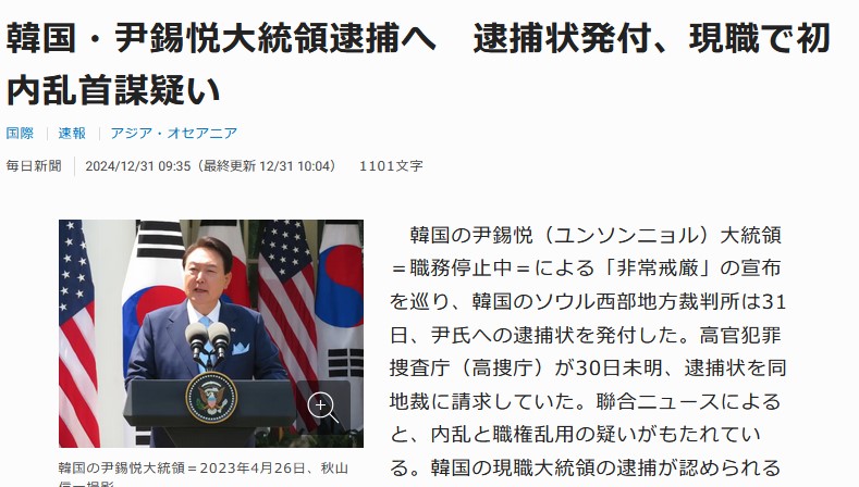 韓国・尹錫悦大統領逮捕へ 逮捕状発付、現職で初 内乱首謀疑い