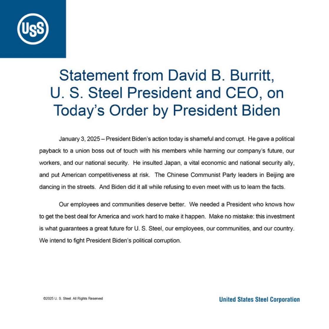 USスチールもアメリカ政府を提訴へ USスチールCEO「バイデンの行動は恥ずべき腐敗したもの。日本を侮辱している」
