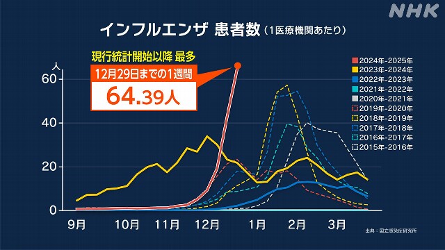インフルエンザ患者数、1医療機関あたり64.39人で現行の統計開始以降で最多に 厚労省「手洗い・マスク着用」