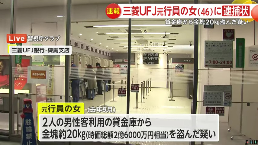【速報】三菱UFJ銀行の貸金庫から金塊2.6億円相当を盗んだ疑いで46歳元行員の女に逮捕状…被害総額10数億円か 警視庁