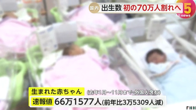 出生数、初の70万人割れへ 24年、1~11月は66万人