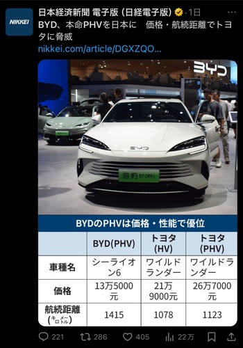 【激震】中国車、日本車に対し性能1.5倍で価格半分と判明し日本人震える