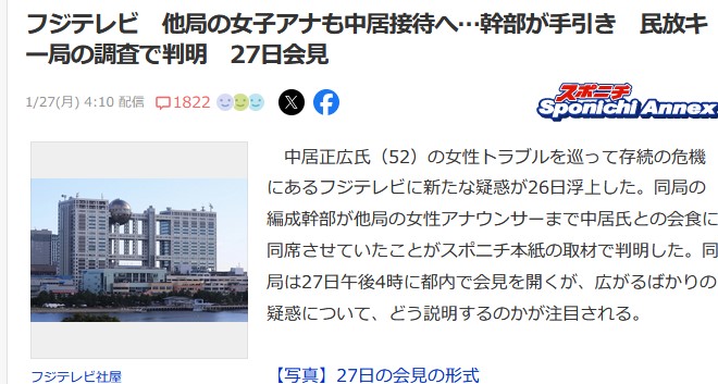 フジテレビ 他局の女子アナも中居接待へ…幹部が手引き 民放キー局の調査で判明 27日会見