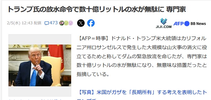 【悲報】トランプ大統領「カリフォルニアの山火事?ダム放水しろ!」 83億リットル放水もロサンゼルスに流入せず 専門家「無意味な措置。水不足の季節はこれから訪れる」