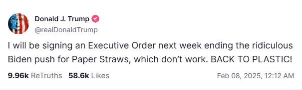 トランプ大統領「機能しない紙ストローを推進するバイデンの馬鹿げた政策を終わらせる。プラスチックに戻しましょう!」
