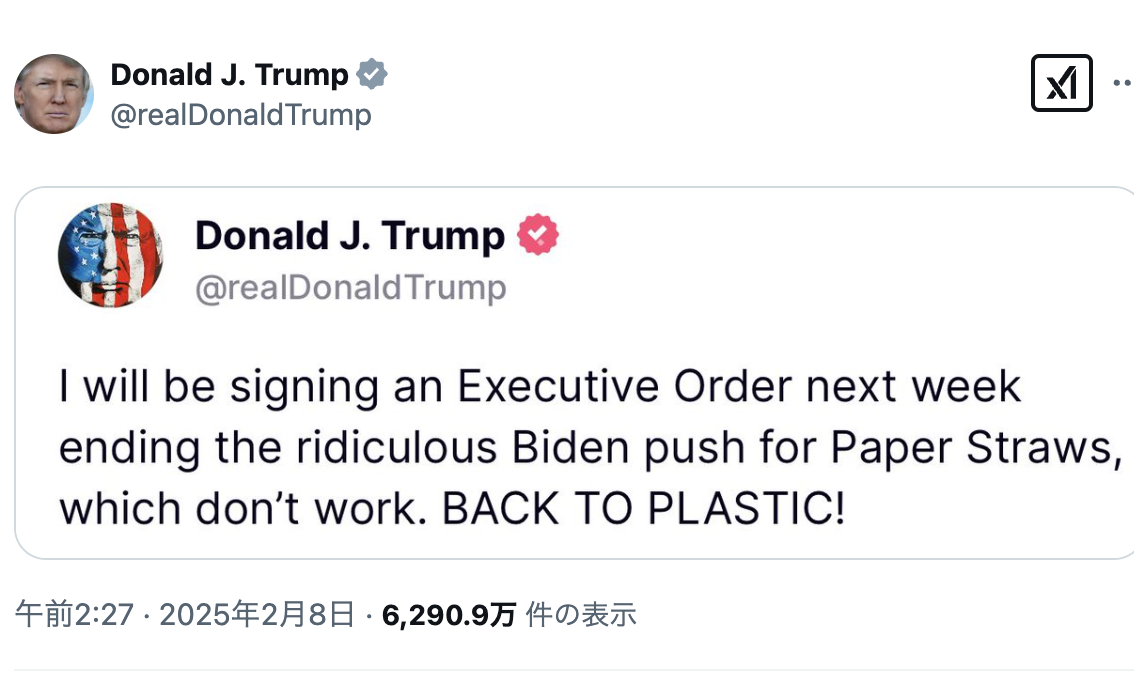 トランプ氏はソーシャルメディアへの投稿で、「来週、大統領令に署名して、役立たずの紙ストローを推進するというバイデンの愚行を終わらせる。プラスチックに戻す!!!」と宣言した。