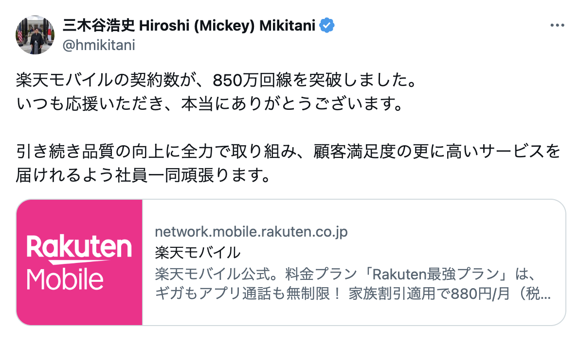 本日、楽天モバイルが、契約数が850万回線を突破したことを発表しました。