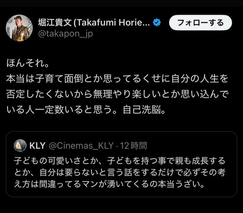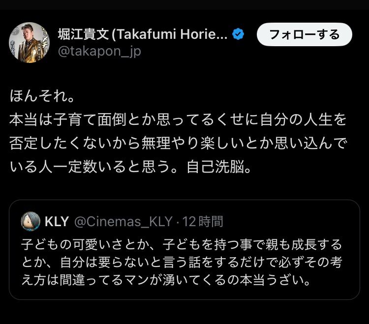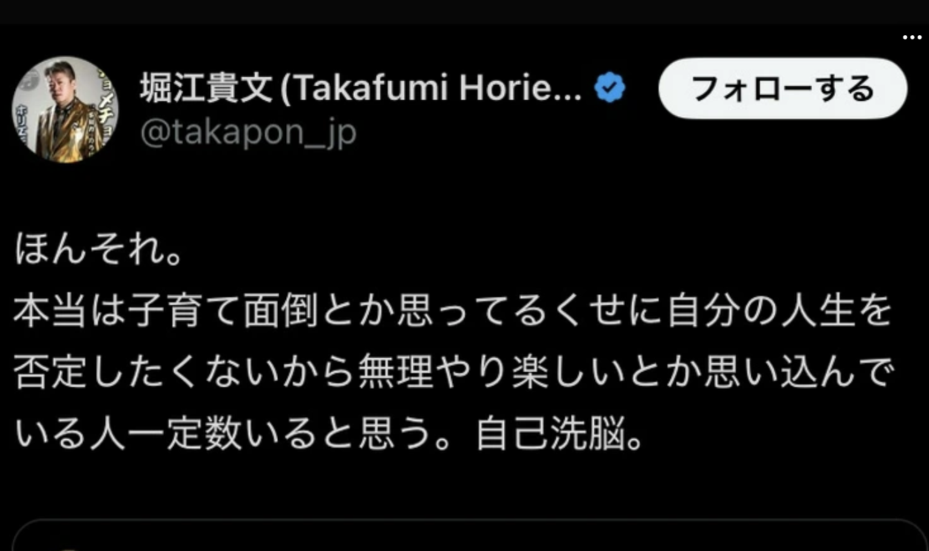 【正論】ホリエモン「子育て面倒だと思ってるのに自分の人生否定したくなくて楽しいと自己洗脳してる奴が一定数いる」