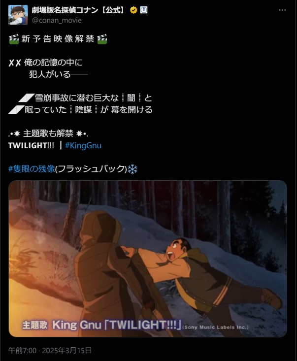 映画「名探偵コナン 隻眼の残像」の主題歌、King Gnuの「TWILIGHT!!!」 新予告映像も解禁