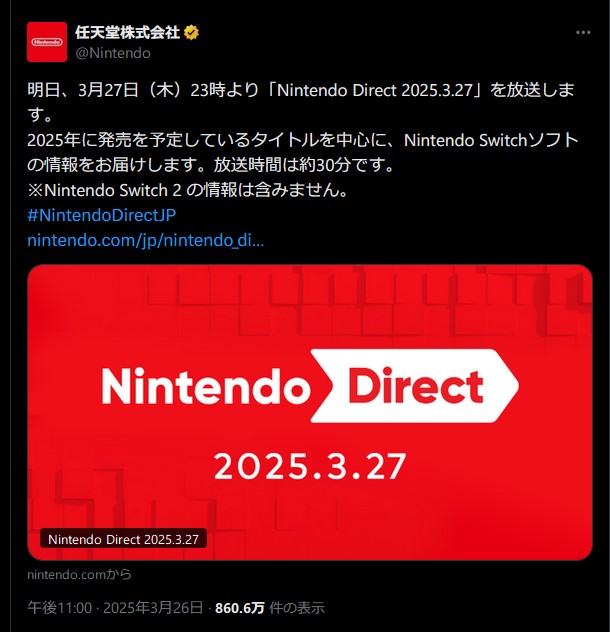 明日、3月27日(木)23時より「Nintendo Direct 2025.3.27」を放送します。