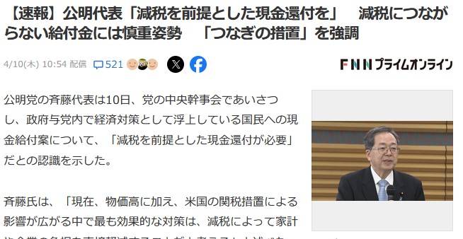 公明党・斎藤代表「減税には時間がかかる。減税を前提とした現金還付が必要」