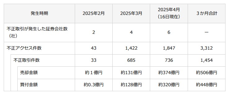 実在する証券会社のウェブサイトを装った偽のウェブサイト(フィッシングサイト)等で窃取した顧客情報(ログインIDやパスワード等)によるインターネット取引サービスでの不正アクセス・不正取引(第三者による取引)の被害が急増
