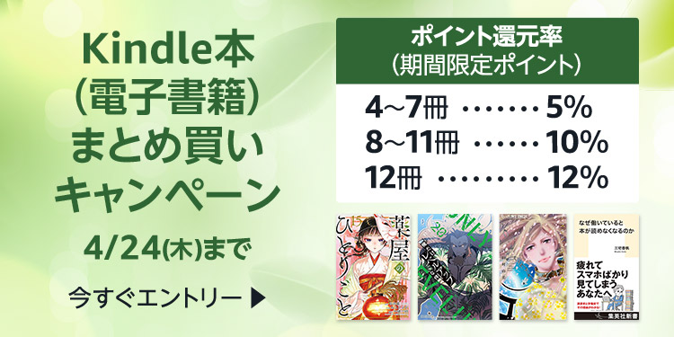 Kindle本まとめ買いキャンペーン 4~7冊5% 8~11冊10% 12冊12%ポイント 2週目(4/24まで)