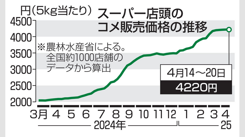 コメ5キロの価格、16週連続上昇で最高値の4220円に 前年比2倍