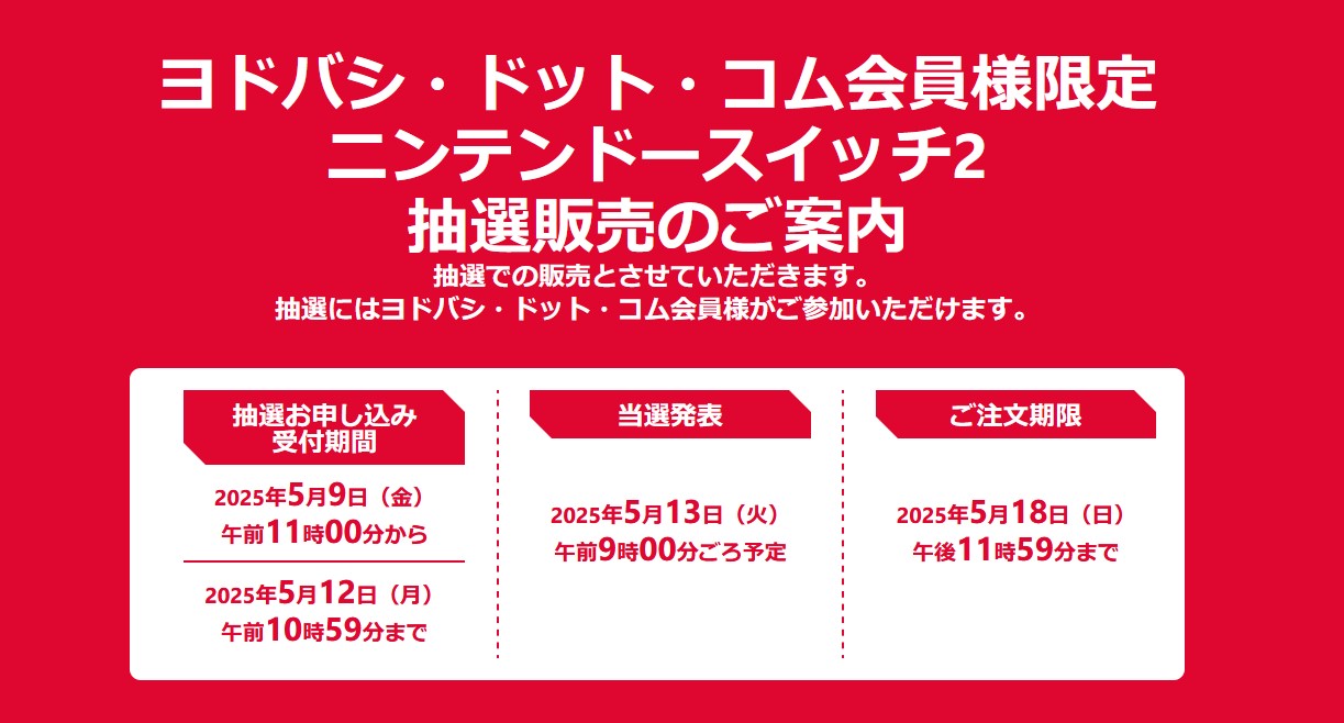 ヨドバシカメラ、「Nintendo Switch2」の抽選受付をついに開始 2024年5月1日~2025年4月30日の期間中に累計5万円以上の購入履歴がある人が対象