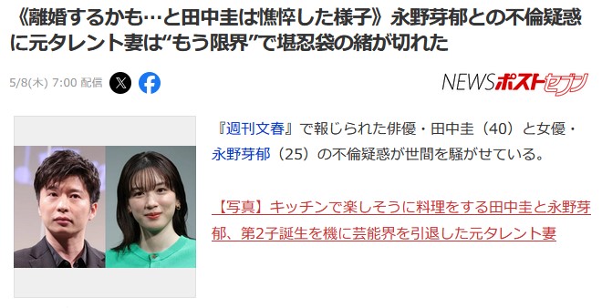 《離婚するかも…と田中圭は憔悴した様子》永野芽郁との不倫疑惑に元タレント妻は“もう限界”で堪忍袋の緒が切れた