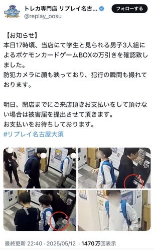 本日17時頃、当店にて学生と見られる男子3人組によるポケモンカードゲームBOXの万引きを確認致しました。