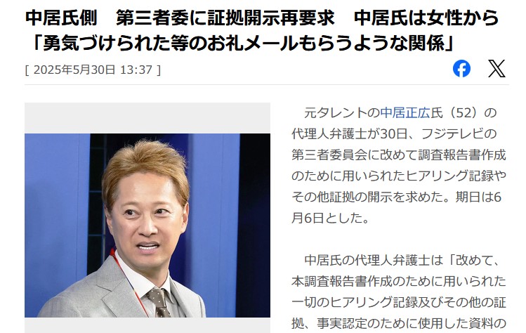 中居氏側 第三者委に証拠開示再要求 中居氏は女性から「勇気づけられた等のお礼メールもらうような関係」