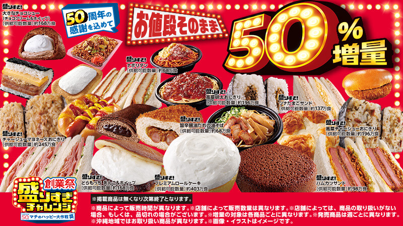 ローソン「50%増量 盛りすぎチャレンジ」のラインナップ公開