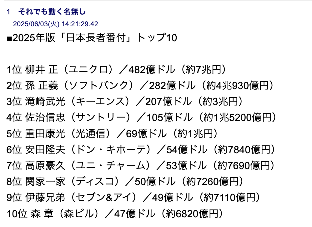 【悲報】2025年版「日本長者番付」トップ10がこちら