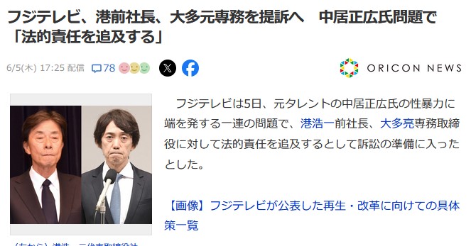 フジテレビ、港前社長、大多元専務を提訴へ 中居正広氏問題で「法的責任を追及する」