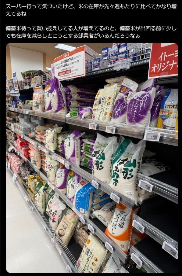 【謎】品薄だったスーパーの米の在庫が急に復活し山積みに