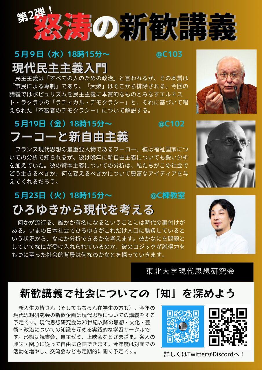 現代思想研究会、怒涛の新歓講義第2弾です!今月はラクラウ、フーコー、そしてひろゆき論をやります。興味がある人はドシドシ来てください。もちろん新入生以外も大歓迎!お待ちしています。 https://t.co/euiCQaHPy3