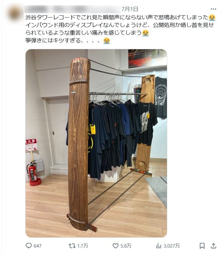 発端は、ある演奏家の投稿したポストだ。タワーレコード渋谷店に置いてあったというハンガーラックは、箏が向かい合わせに縦置きで固定され、それぞれに穴を開けて間にポールをわたしたもの。ポールには多数のTシャツがかけられており、演奏家がXに、