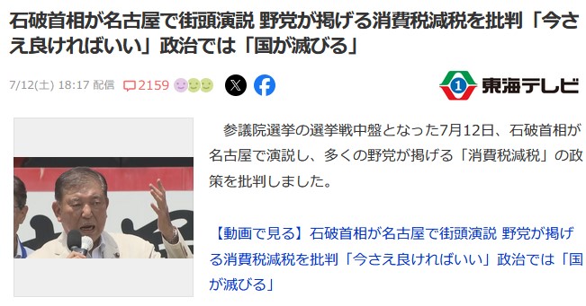 石破首相が街頭演説で、消費減税には1年かかると主張した際に「今さえ良ければ、自分たちさえ良ければいいとか、そういう政治が横行したときに国は滅びるのだ」と発言