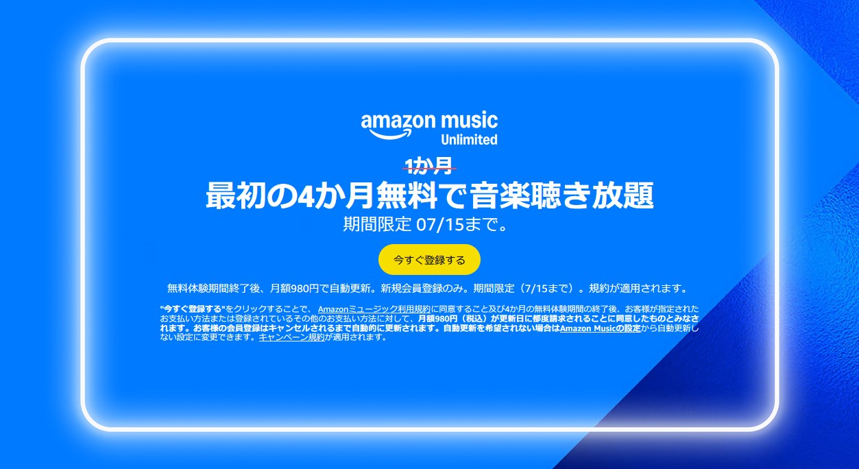 Amazon Music Unlimited 最初の4か月無料 (7/15まで)