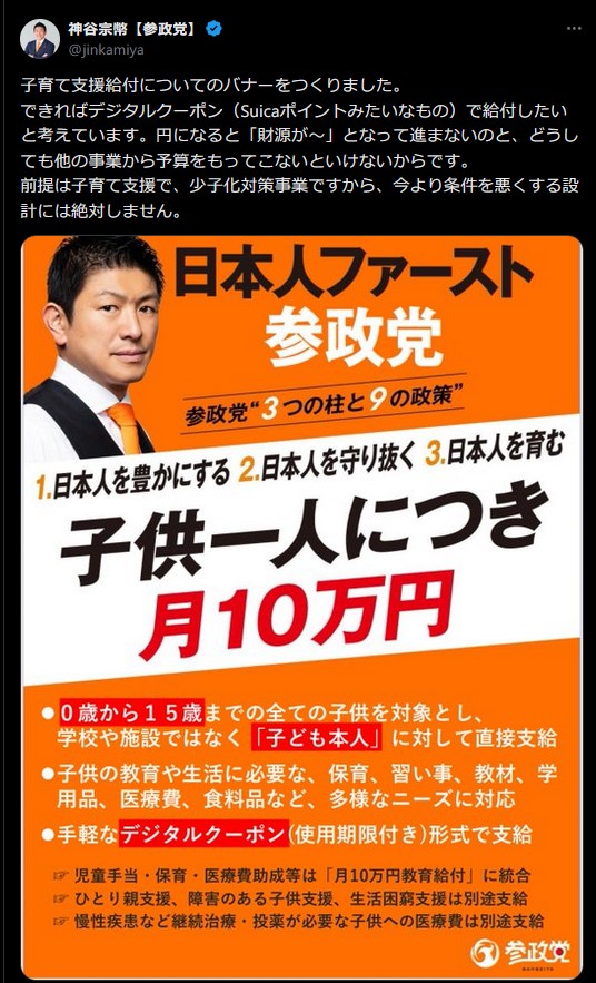 参政党・神谷代表「子ども一人につき月10万、円ではなくデジタルクーポン(Suicaポイントみたいなもの)で給付するので財源は心配しなくてOK」