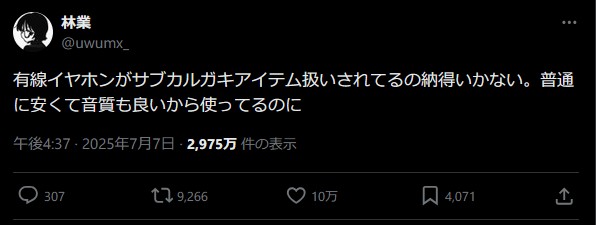 有線イヤホン愛用者の正論が話題に「有線イヤホンがサブカルガキアイテム扱いで納得行かない。普通に安くて音質も良いから使ってる」