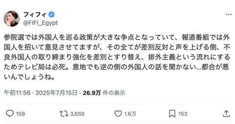 参院選では外国人を巡る政策が大きな争点となっていて、報道番組では外国人を招いて意見させてますが、その全てが差別反対と声を上げる側、不良外国人の取り締まり強化を差別とすり替え、排外主義という流れにするためテレビ局は必死。意地でも逆の側の外国人の話を聞かない…都合が悪いんでしょうね。