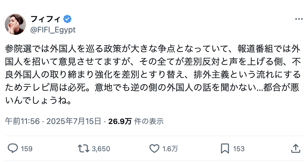 フィフィ「テレビに呼ばれるのは、不良外国の取り締まり強化を差別とすり替え排外主義と批判する外国人ばかり。意地でも逆の側の外国人の話を聞かない…都合が悪いんでしょうね」